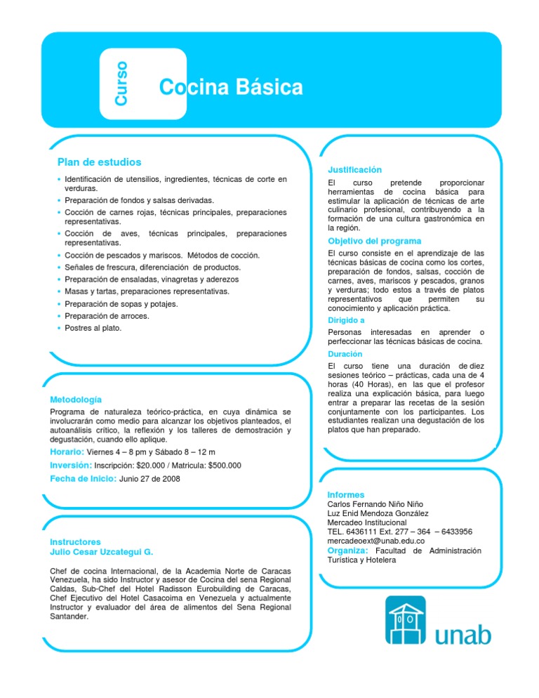 El curso pretende proporcionar herramientas de cocina básica para estimular la aplicación de técnicas de arte culinario profesional, contribuyendo a la formación de una cultura gastronómica en la. La cocina es el arte gastronómico, compuesto de recetas, técnicas o información sobre los alimentos que consumimos, propiedades y nutrientes. Cursos gratuitos presenciales y a distancia en 2020: Conviértete en un experto en gastronomía con formaciones profesionales 100% presencial. Start by marking microondas, cocina basica as want to read Prime cursos um novo conceito em cursos online grátis. Read reviews from world's largest community for readers. Portal dedicado a ofrecer información sobre cursos, másters, postgrados, carreras, fp, oposiciones tanto a distancia como on line y presencial. ¡obtén ahora más información sobre el curso de universidad cocina básica! O curso de matemática básica oferece uma revisão sobre o conteúdo visto no ensino fundamental, para ajudar o aluno a fixar conhecimentos básicos na área. Descubre, elabora y decora pizzas, sushi, crepas, cupcakes, snacks y más. En cocina básica y fresca encontraras recetas fáciles, con productos frescos y naturales, de temporada. Objetivo generaldesarrollar habilidades básicas para el uso de las técnicas de la cocina gourmet, cortes.